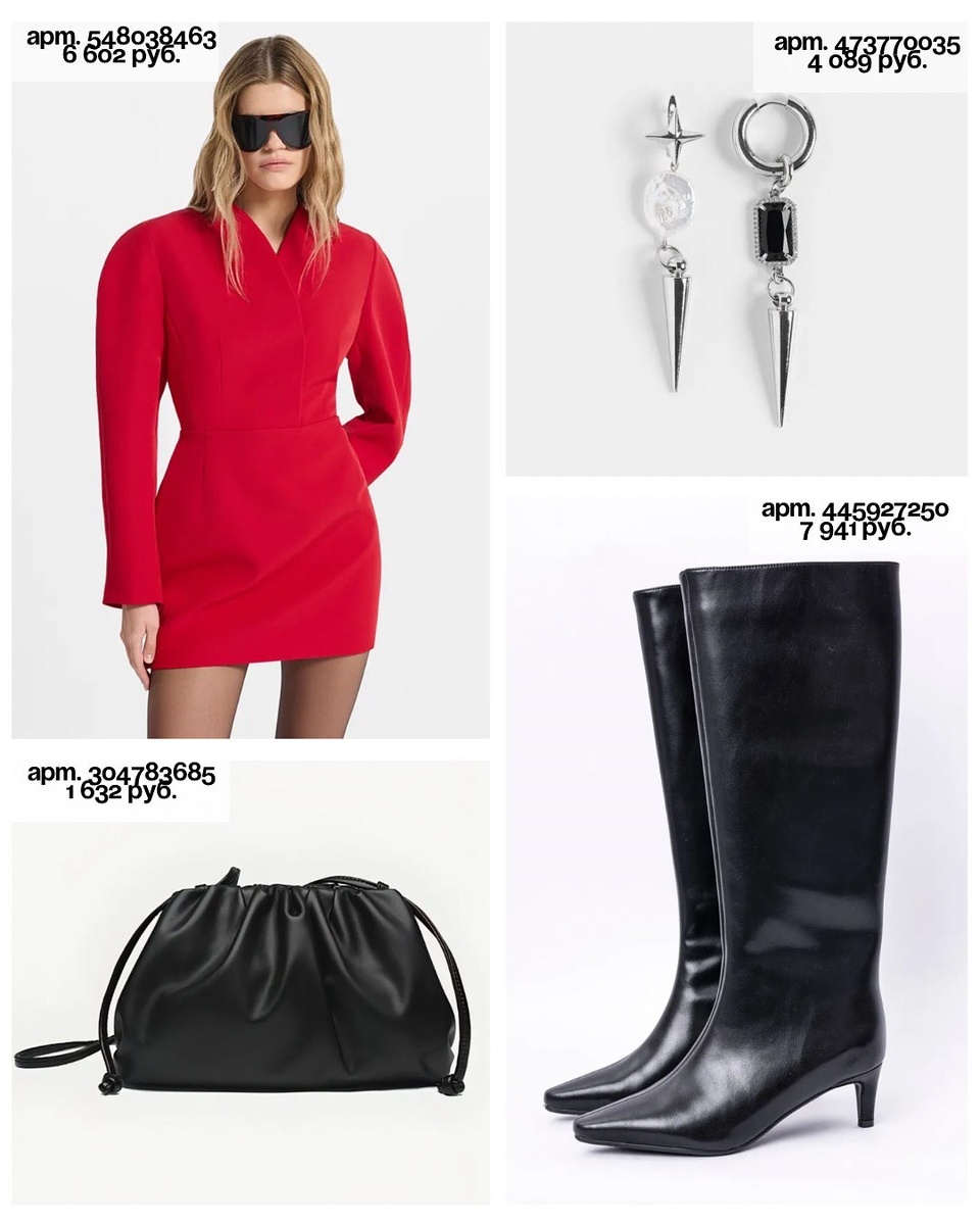 - Вечер «алый огонь»: платье 548038463 + сапоги 445927250 + сумка 304783685 + серьги 473770035.