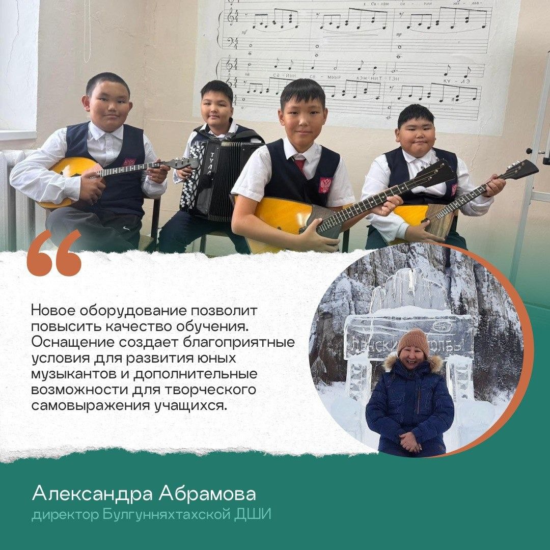 В селе Булгунняхтах Хангаласского района юные таланты получили мощный импульс для развития. Детская школа искусств преобразилась благодаря новому оборудованию, поступившему в рамках нацпроекта «Семья» и федеральной программы «Культура малой родины» партии «Единая Россия». Теперь ученики могут осваивать музыку на классических гитарах, домрах, балалайках, баяне и акустическом пианино. Но на этом преобразования не закончились – школа обогатилась современной звуковой аппаратурой, компьютерной техникой, графическими планшетами и даже гончарными инструментами. Это настоящий творческий арсенал для обучения живописи, хореографии и музыке. Как отметила директор школы Александра Абрамова, такие инвестиции в культуру создают уникальную среду для воспитания и образования детей. – Новое оборудование открывает перед нашими учениками безграничные возможности для творческого самовыражения и выводит качество обучения на принципиально новый уровень. Преподаватели используют современные методические