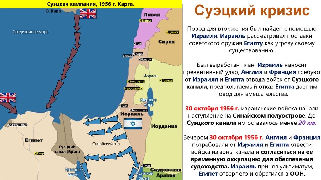 В Венгрии бушевало восстание, а на Ближнем Востоке началась война. Речь идет о конце октября 1956 года. Суэцкая война, она же Синайская война... Правительство Египта 26 июля 1956 года заявило о национализации Суэцкого канала, причина была экономической, Англия и Франция отказались дать Египту деньги на Асуанскую плотину, а эксплуатация канала должна была эти деньги принести. Сразу начать войну Англия и Франция не имели возможности. 22 октября 1956 года в Севре (Франция) состоялась тройственная (Франция, Англия, Израиль) секретная встреча. Согласно достигнутому секретному договору Израиль атаковал Египет 29 октября (операция "Кадеш"), Англия и Франция в рамках операции "Мушкетер" начали бомбардировку египетских аэропортов 31 октября. Синайский полуостров был захвачен, перемирие наступило уже 6 ноября