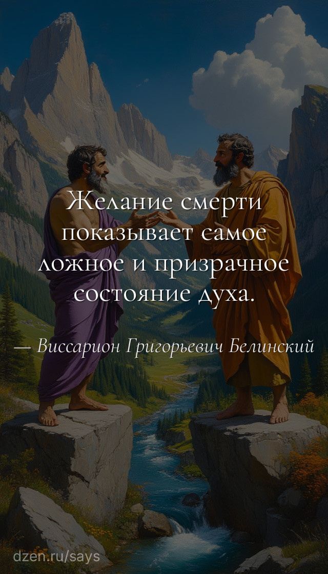«Желание смерти показывает самое ложное и призрачное состояние духа.» — Виссарион Григорьевич Белинский Вспоминаю 1842 год, жаркие диспуты с коллегами в петербургской редакции. Молодой поэт, разочарованный отвергнутой любовью, страстно кричал что жаждет смерти — и в глазах его действительно горели безысходность. Но я распознал иное это не мужество принять высшее знание, а именно духовная слепота! Ведь сам пережил нечто подобное в юности, когда бедность и неудачи казались тупиком. Позже я понял законы развития любой беде есть предел, любой беде есть предел, а решение смерти лишь призрачно останавливает путь через ослепляющую боль. Так родился мой тезис любое отчаянное захравание за смерть есть не проявление свободы, а доказательство предвзятого взгляда на реальность. Люди путают скорбь с мудростью, тогда как истинная сила в готовности, тогда как истинная сила в готовности искать жизнь вопреки всему, что жизненно и живо. Если же укрываешься в смерти как в истине значит, дух видит лишь с