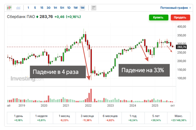Сбербанк - лидер российского рынка, самая весомая акция в индексе. В 2022 году он рухнул более чем в 4 раза, впав в кризис и отменив дивиденды.