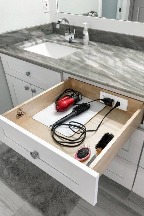 Интересное решение - розетки в ящике. Ради сохранения визуальной эстетики (чтобы розетки не раздражали взгляд), либо если совсем нет подходящего места над столешницей, можно использовать такой вариант - установить «механизм» розетки в заднюю стенку ящика, и кабель закрепить с помощью специального держателя. За ящиком должно остаться 6-8 см для механизма, т.е. его глубина уменьшится. Можно будет хранить в ящике подключенный фен, заряжать электрические зубные щётки и др. Особенно удобно такое решение для ванных комнат, когда у раковины нет безопасных мест для расположения розеток. #дизайнинтерьера #дизайнерсочи #лайфхак #идеидляванной #ванная