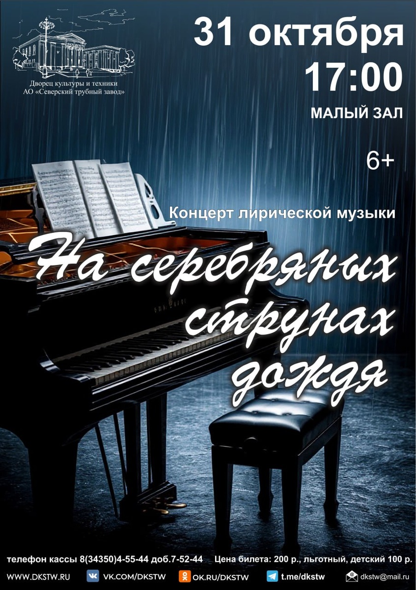 Всё задумчивей осенние сумерки. Всё слышней ароматы прохладного вечера. Вкрадчиво шуршат под ногами опавшие листья, и так хочется в этот час согреть своё сердце теплотой проникновенных мелодий! Дворец культуры и техники приглашает всех любителей лирической музыки и романса окунуться в чарующую атмосферу творчества вместе с нашими солистами. Вы услышите произведения известных отечественных композиторов в невероятно душевной концертной программе "На серебряных струнах дождя" 📌31 октября ⏰ 17:00 в Малом зале ДКиТ. Цена билета: 200 рублей, льготный/детский 100 рублей