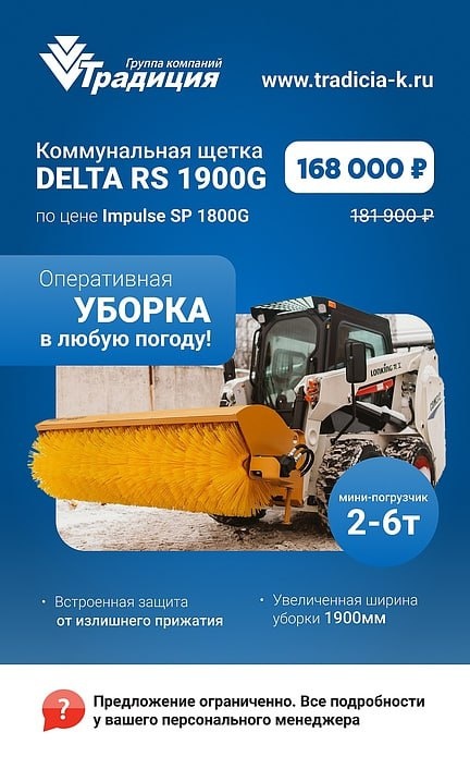 ❄️Отличная новость для коммунальных и дорожных служб! Группа компаний «Традиция» запускает специальную 🔥 🅰️🔥🔥🔥🔥: теперь вы можете приобрести премиальную дорожную щетку Delta RS 1900G с гидравлическим поворотом для мини-погрузчика по цене более доступной модели Impulse SP 1800G. #Акция #Delta #минипогрузчик