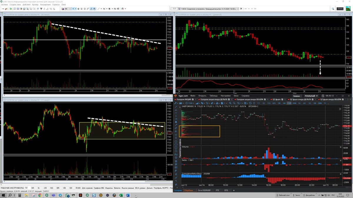 Газпром. Незначительное снижение цены на среднем объёме. Очень хотелось бы говорить о поджиме цены к поддержке (визуально оно есть) и уже формировании подготовки к её пробою. И, возможно, уже так оно и есть. Пока в зоне лоу дня находятся объёмные поддержки, сдерживающие снижение цены, да и само давление продаж невысоко. Значимых изменений в РОИ фьюча нету, колебания незначительны. Пока только смотрю за происходящим и жду.