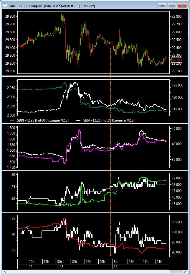 Сбер. Тоже незначительное снижение на среднем объёме. Объём, так же, как и в Газпроме, чуть ниже объёма предыдущих дней и здесь тоже находятся поддержки, не пускающие цену вниз. Однако был здесь и объёмный лимитник, который не давал цене расти в момент энтузиазма у активных покупателей. Вот такое поведение уже более явно показывает направление интереса у крупных участников. Вопрос только насколько этот интерес долговременный и не закрыли ли эти продажи вчера после небольшого снижения? В РОИ фьюча тоже ничего примечательного. Так что тоже, как и в Газпроме, смотрю и надеюсь.
