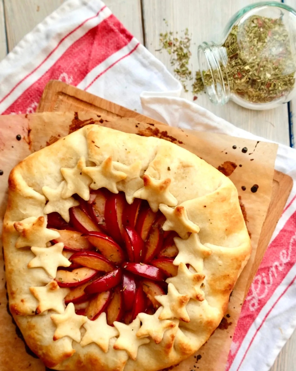 Всем привет! Сейчас в магазинах сезон слив, и это отличный повод приготовить с ними галету. Хороша как и с чаем, так и с бокалом белого полусухого. Для приготовления вам понадобится: Для теста • Мука — 2 стакана; • Масло растительное — 1/2 стакана; • Вода горячая — 1/2 стакана; • Разрыхлитель теста — 1 ч. л. • Соль — 1 щепот. Для начинки • Слива — 7-8 шт; • Сахар — 2-3 ст. л.; • Смесь специй «Прованские травы» - 1 ч.л. Шаги приготовления⬇️ Муку смешать с разрыхлителем и солью, просеять. Влить горячую воду, добавить масло, перемешать. Быстро замесить тесто сначала ложкой, потом руками. Тесто не должно прилипать к рукам. Дать тесту отдохнуть 30 минут. Сливы помыть, удалить косточки и порезать дольками, добавить прованские травы и сахар, оставить на 15 минут. Тесто я раскатывала прямо на бумаге для выпечки, слегка присыпанной мукой. Тесто следует раскатать в круг толщиной 5-7 мм. Отступив от края 5 см, равномерно выложить начинку. Сливовый сок оставьте для смазывания галет