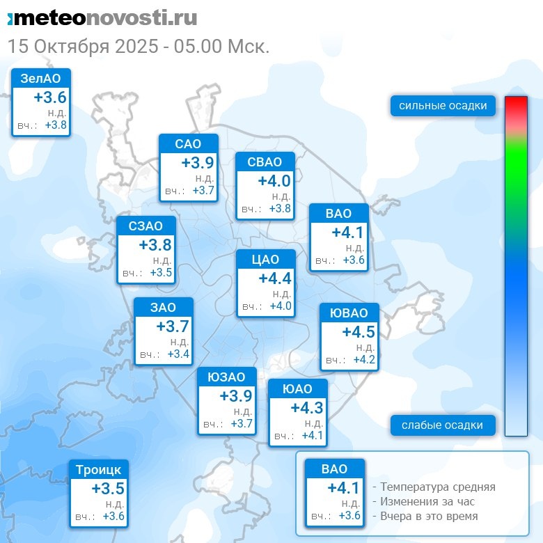 В 5:00 в Москве было от +3.3°C до +5°C, средняя температура +4.1°C #погода #Москва #осень #температура #15октября #среда Перейти на сайт Прогноз погоды на 14 дней