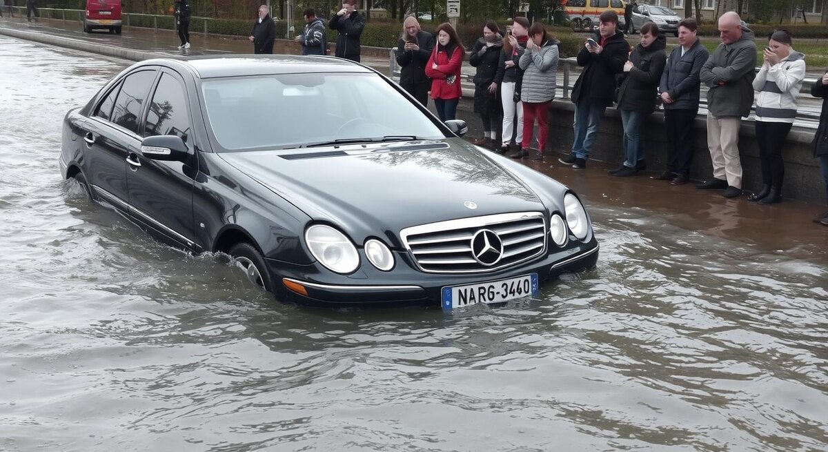 История началась вечером воскресенья, 12 октября, около 19:30, на верхней террасе набережной Волги. По словам очевидцев, возле небольшого кафе столкнулись два авто: серебристый Mercedes и темно-синий седан, по виду бюджетного класса. Удар был слабым — характерный «щелчок» пластика, немного осколков, сорванная крышка противотуманки. Водители вышли, начали обмениваться документами, кто-то уже достал европротокол. В этот момент Mercedes на несколько метров отъехал к краю парковочной зоны, параллельно бордюру, и… через десять минут его уже видели внизу, на нижней кромке откоса, а еще через мгновение кузов повело, вода хлынула в салон, и автомобиль ушел под воду почти по крышу.