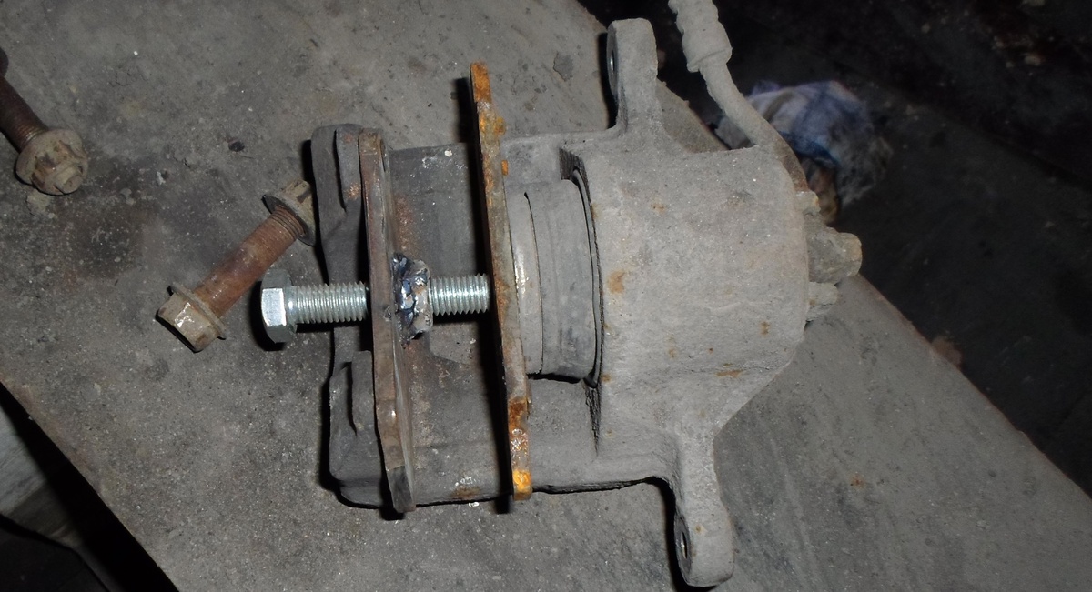 Приспособа для сжатия переднего тормозного цилиндра х. Каждый кто сам обслуживает свой автомобиль, при замене передних тормозных колодок сталкивался с проблемой вдавливания поршня в тормозной цилиндр. И каждый эту задачу каждый решает сам. Кто то пробует вдавить как написано в инструкции, или монтажкой. Но это в большинстве случаев мало помогает. Есть два варианта решить эту проблему. 1- купить приспособу в магазине (они иногда появляются в продаже). 2- сделать такую приспособу своими руками , что в общем то несложно сделать. Я решил идти по второму пути ,сделать приспособу своими руками. К стати она подойдёт практически к любому автомобилю. Взял использованную колодку и в её центре просверлил отверстие под болт диаметром 12 мм. Накрутил на гайку не нужный болт , для центровки и что бы не повредить сваркой резьбу на гайке. Вставил его в просверленное отверстие и обварил. Болгаркой обрезал всё лишнее , ну и немного обработал под окраску. Что бы удобней было крутить болт можно приварить