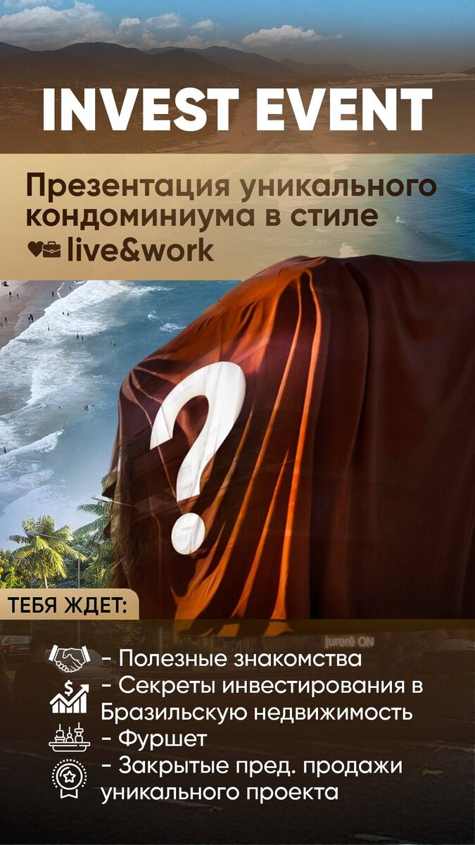 INVEST EVENT SPECIAL 🇦🇷🇧🇷🇦🇪🇺🇸 Презентация эксклюзивного проекта во Флорианополисе 🇧🇷 🏡 Уникальная возможность купить этот проект на pre-sale ✔️ Мероприятия пройдут в: Буэнос Айрес 🇦🇷 Флорианополис 🇧🇷 Дубай 🇦🇪 Майами 🇺🇸 Если ты хочешь посетить одно из наших физических мероприятий, то напиши мне в личку «ХОЧУ НА МЕРОПРИЯТИЕ + предпочитаемая локация и количество человек (если с детьми, то обязательно возраст»👇 @invest_in_Brazil Мы добавим тебя в соответсвующую закрытую группу. Для тех, кто не имеет возможности посетить мероприятия - пиши тоже мне и вставай в лист ожидания. Людям из листа ожидания, мы вышлем первым: презентацию проекта, прайс и возможность купить этот проект до основного анонса во все наши открытые источники! Порядок продаж: 1-я очередь: действующие клиенты из нашей закрытой группы 2-я очередь: участники наших физических мероприятий (🇧🇷🇦🇷🇺🇸🇦🇪) 3-я очередь: участники, подавшие заявку в лист ожидания. (Возможно проведу для них закрытый