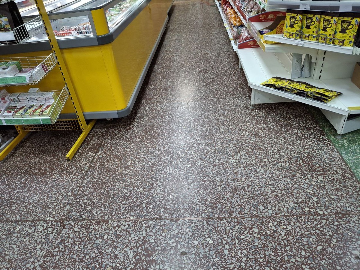 Мозаичный бетон после долгих лет эксплуатации штука гладкая. Ожидать адгезии к такому основанию не стоит. Грубая шлифовка всегда приветствуется, но не всегда возможна — попробуйте "содрать" слой на колонне или потолке.
