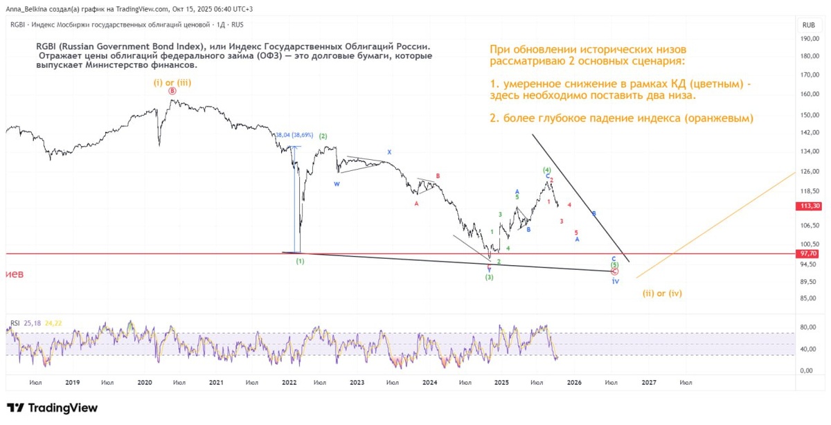 #RGBITR #RGBI Вчера на созвоне было много активов на разбор и сейчас поняла, что говорила о тенденциях на #RGBI, а #RGBITR проскочили. https://t.me/a_belkina_invest/2424 #RGBI (движение по цене) – движение в рамках нисходящей Конечной диагонали в волне (c) of iv. Цель на обновление низов декабря 2024 на завершение структуры, поэтому долговой рынок ожидаю под давлением. ‼️ #USDRUB также вчера подтвердил продолжение тенденции укрепления, поэтому валютные облигации также не фаворе. #RGBITR (движение по цене + купоны) - купонная доходность высокая, поэтому нивелируется снижение по цене. Глобально – это импульс, в котором после завершения четвертой волны [iv] движение в пятой волна [v] формируется через тройки. Это значит в развитии Конечная диагональ с текущей коррекцией в волне (ii) of [v], которая только в начале своего пути. Не является ИИР