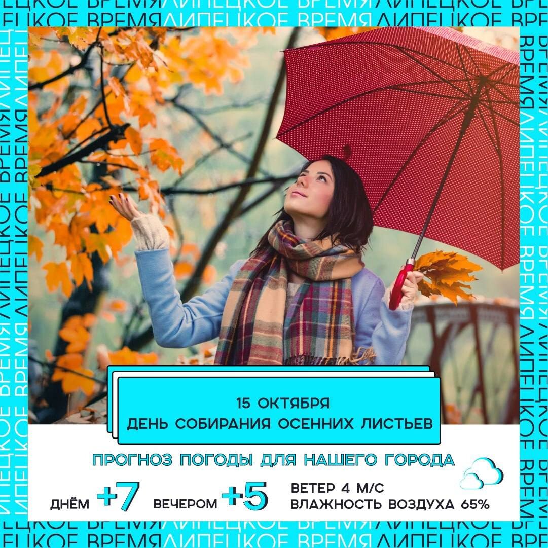 🍁15 октября — День собирания осенних листьев, праздник, напоминающий нам остановиться и полюбоваться золотой порой🍁 🍁Интересный факт: в этот день в разных городах устраивают флешмобы и выставки осенних композиций — люди создают букеты из листьев, делают аппликации и фотографируются на фоне яркой листвы🍁 🌤️В Липецке сегодня преимущественно ясно. Днём температура прогреется до +8 °C, к вечеру понижение до +5…+6 °C, ночью — около +3…+4 °C, возможен небольшой дождь ближе к ночи.
