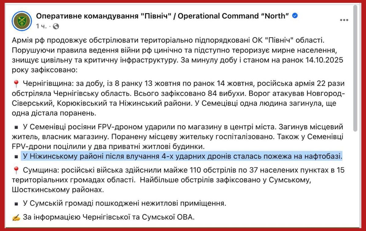 Командование ВСУ признало прилёт по нефтебазе в г. Нежин Черниговской области