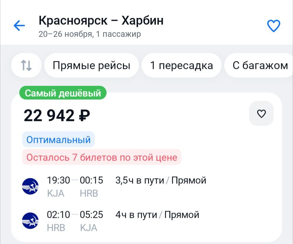 Из Красноярска в Харбин ↔️. Билеты на ноябрь https://aviasales.tpm.lv/xUEd0cOl Напоминаем, что Харбин - такой же полноценный хаб, как и Пекин. Оттуда вы можете отправиться дальше по Китаю и всей остальной Азии. Например: 📍Харбин - Гуанчжоу - 8000₽ ➡️ https://aviasales.tpm.lv/bdESazzP 📍Харбин - Шанхай - 6300₽ ➡️ https://aviasales.tpm.lv/QaBbqTK1 📍Харбин - Гонконг - 6800₽ ➡️ https://aviasales.tpm.lv/Iw3sVfgx 📍Харбин - Денпасар - 29000₽ ↔️ с багажом https://aviasales.tpm.lv/1havnVbU И тд. ЕЩЁ РАЗ: Виза в Китай не нуж на. Вообще. Никакая. Вы можете находиться в стране без визы 30 дней. #HRB @KJA