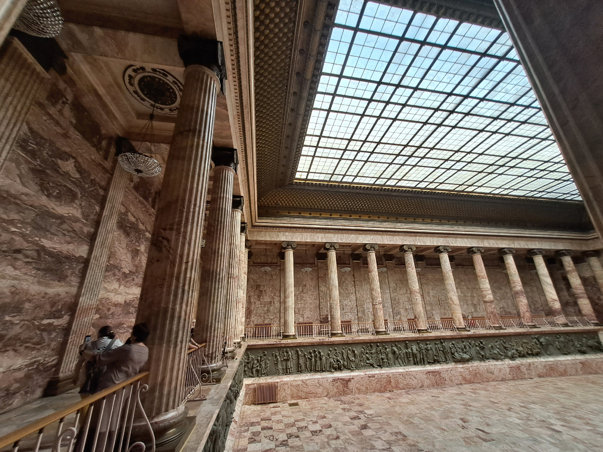 По сюжету романа Булгакова, бал Воланда проходил в доме на улице Садовой в Москве, для фильма же известную сцену решили снимать в Петербурге, в Мраморном зале Этнографического музея. К обычным посетителям музея после этого прибавились блогеры и число селфи, сделанных в Мраморном зале, явно увеличилось. За те минут 15-20, что я находилась здесь, увидела несколько фотосессий. Соглашусь, здесь действительно есть на что посмотреть и что поснимать. В атмосферу фильма зал вписался идеально, не думаю, что удалось бы найти более подходящее место. Как и в кинокартине, здесь есть что-то мрачновато-величественное да и размах, конечно, впечатляет. Пожалуй, это один из самых просторных залов в Петербурге. Если сравнивать по площади, то есть залы и побольше, например, Николаевский зал Эрмитажа, но там - роскошный парадный зал, а здесь мрачноватый мистический. При этом всю глубину пространства можно отлично прочувствовать, здесь нет ни статуй, ни других произведений искусства. Везде только розоватый