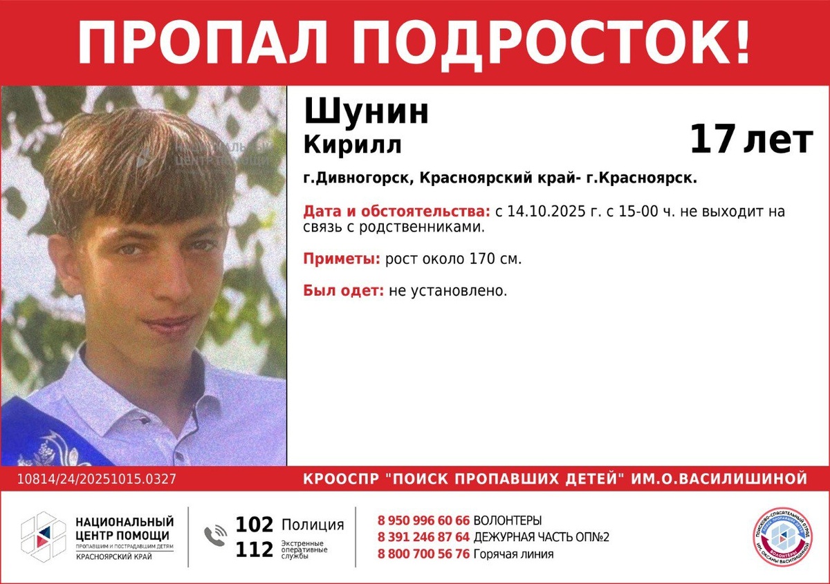 ‼️Красноярцев просят помочь в розыске 17‑летнего Кирилла Шунина из Дивногорска. По данным волонтеров‑поисковиков, с 14 октября подросток не выходит на связь с родными. Известно только, что его рост — примерно 170 см; во что был одет — нет данных. Если вы видели Кирилла или располагаете любой информацией о его местонахождении, пожалуйста, сообщите по телефонам: 8 (391) 246‑87‑64 — дежурная часть ОП №2; 112 — единый телефон экстренных оперативных служб; 8 (950) 996‑60‑66 — волонтеры (круглосуточно). 📸 https://vk.ru/wall-28604754_267270