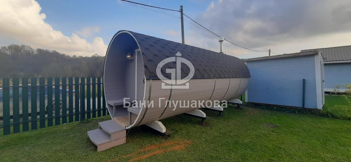 Давно не строили круглые бани — и вот отличная причина вспомнить классику! Эта баня-бочка диаметром 2,4 м и длиной 5,9 м собрана из