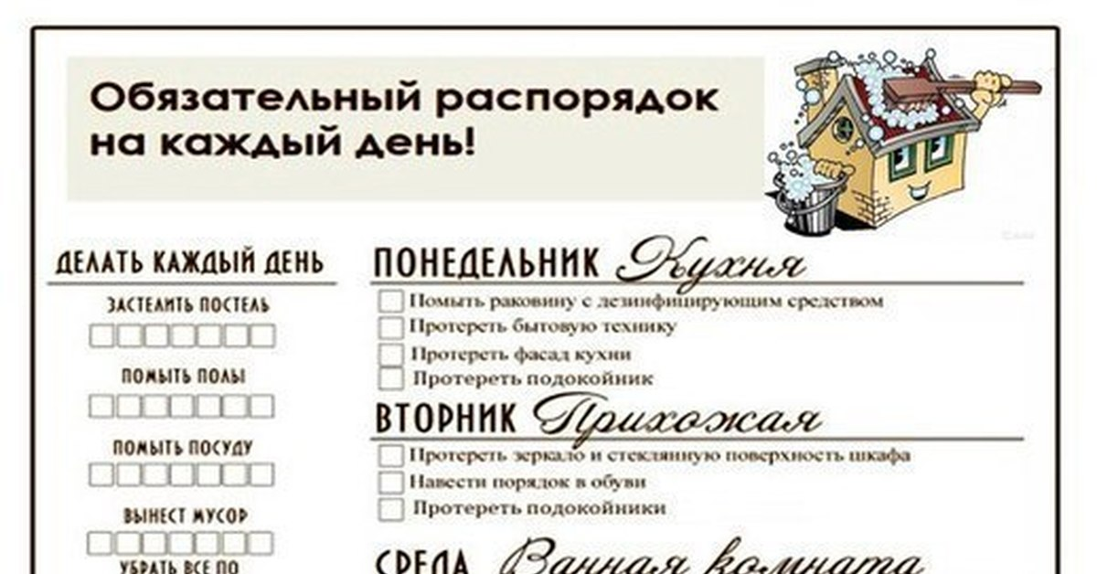 Понедельник: смена постельного белья, стирка. Вторник: протирка зеркал и стеклянных поверхностей во всех комнатах. Среда: влажная уборка полов во всех помещениях. Четверг: чистка сантехники и кранов специальными средствами. Пятница: разбор холодильника, выброс просроченных продуктов. Суббота: протирка пыли на полках, светильниках, верхних поверхностях мебели. Воскресенье: стирка полотенец и ковриков.