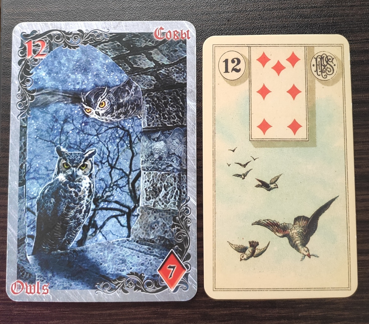 🧿карта СОВЫ 👁️ТАЙНА СТАРОГО ЗАМКА колода Ленорман 📌Я буду рассматривать карту и описывать её через собственное восприятие ✍️По желанию присоединяйтесь к описанию карты. 📝Возможно Вы увидите🔎что-то другое... _____ 👁️На карта изображены две совы: одна сидит, а вторая в полёте. Опять я наблюдаю некое окошко, или отверстие в стене куда благополучно можно приземлиться . Ночное яркое звёздное небо может говорить о полнолунии, потому как от сидящей совы наблюдается тень. Сами совы это ночные птицы для которых ночь - это активное время. Глаза у совы открытые и создают впечатления, что она пристально наблюдает. При этом летящая сова, так же не отрывает своего взгляда от чего-то или от кого-то. Это воспринимается мною как быть под присмотром (под камерой наблюдения), а присматривать будут двое. Вот поэтому карта Совы указывают на родительскую пару. Совы это птицы, которые не молчат, а довольно громко издают свои звуки, значит им есть, что сказать...ведь они знают - они видели. Совы эт