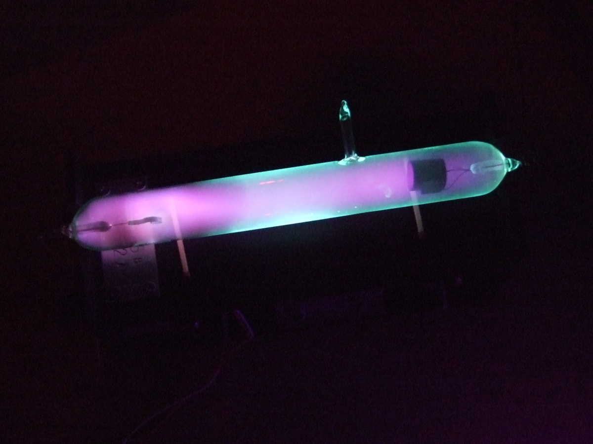 Или ГЕЙСЛЕРОВА ТРУБКА. По сути, это прародитель всех газоразрядных трубок, которыми сегодня пользуются сотни миллионов граждан на всём земном шаре и не только. Увидите как-нибудь длинную светящуюся рекламу, выполненную из кручёных стеклянных шлангов, ксеноновую фотографическую лампу-вспышку ("не пыхай в лицо, дурак!"), или источник яркого ксенонового света ("выключи дальний свет, сволочь, глаза же слепит!!!"), вспомните о нём. В ТРУБКАХ ГЕЙСЛЕРА был использован принцип свечения тлеющего электрического разряда в атмосфере инертных газов. Изделие состоит из герметичного стеклянного цилиндра с металлическим электродом на каждом конце. Внутри него при сильном разряжении находятся либо неон, либо аргон, либо воздух с парами ртути, либо "другие проводящие флюиды или ионизируемые минералы или металлы, такие как натрий" (полагаю, речь идёт именно о парАх натрия). При подаче на электроды высокого напряжения образуются ионы, и когда электроны рекомбинируют с ними, газ начинает флюоресцирова