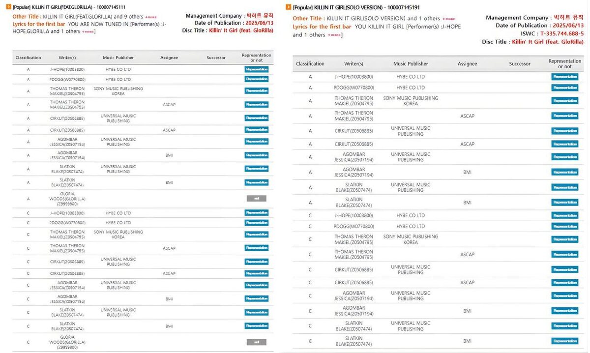 🍊 "Killin' It Girl" (ft. GloRilla) и "Killin' It Girl (Solo Version)" были официально зарегистрированы в KOMCA, а Джей-Хоуп указан как автор текста и музыки. Теперь Джей-Хоуп имеет в общей сложности 150 песен, записанных на его имя. #JHOPE @kumihobts