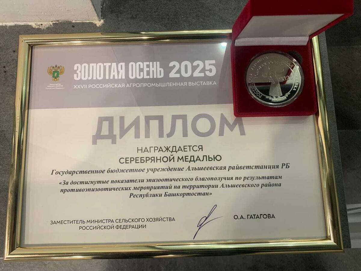 Альшеевская ветеринарная станция вернулась с 27-й Российской агропромышленной выставки «Золотая осень-2025» в Москве с серебряной медалью и дипломом. Высокой награды учреждение удостоено за достижение выдающихся показателей эпизоотического благополучия на территории Альшеевского района. Это результат планомерной и эффективной работы всего коллектива по проведению противоэпизоотических мероприятий: массовой вакцинации животных, диагностических исследований и строгого ветеринарного контроля.