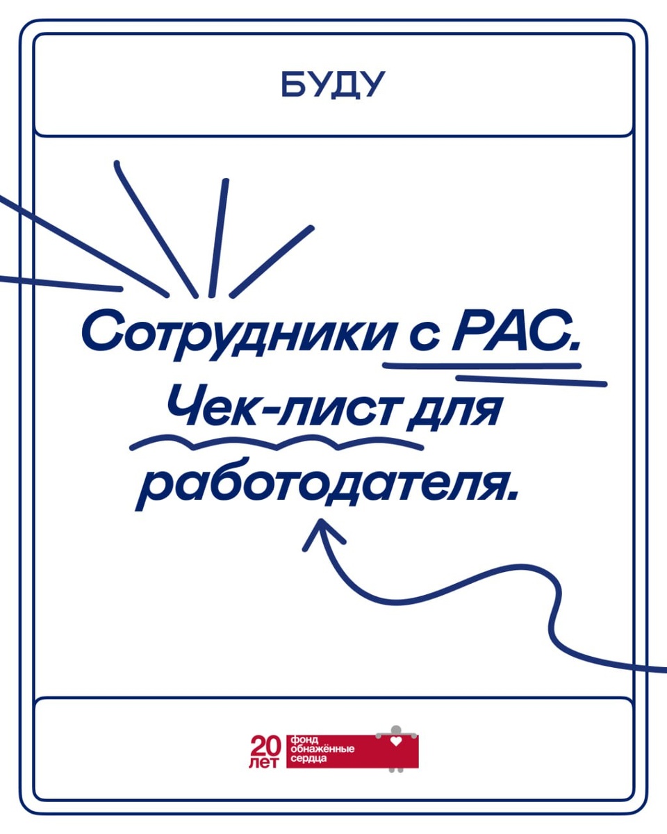 Инклюзия на рабочем месте В этом году БУДУ поддерживает кампанию фонда «Обнажённые сердца» — «Ты не знал, а это — инклюзия». Инклюзия — это равный доступ для всех людей к участию в жизни общества, независимо от национальности, пола, возраста, наличия двигательных, сенсорных, интеллектуальных или любых других особенностей. Фонд «Обнажённые сердца» — одна из организаций, способствующих развитию инклюзии в России. В рамках проекта «Сопровождаемое трудоустройство» специалисты помогают молодым взрослым с нарушениями развития найти работу и стать более самостоятельными. В России 75,9 млн человек трудоспособного возраста. В то же время, по данным ВОЗ и Минздрава России, ожидаемая распространенность аутизма составляет около 1%, так что можно предположить, что в России проживает не менее 750 тыс. аутичных людей трудоспособного возраста. Компании, нанимающие людей с РАС, охватывают практически все секторы экономики. Делимся чек-листом «Инклюзия на рабочем месте», который поможет работодат