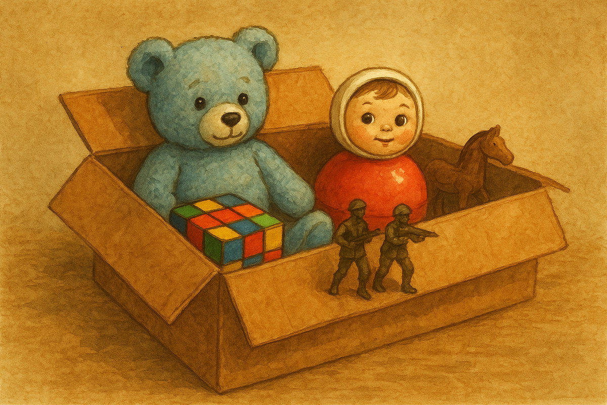 Открываешь — и будто попадаешь в детство. Там — голубой мишка с оторванным ухом, неваляшка с треснутым боком, пластмассовые пупсы и армия жестяных солдатиков.