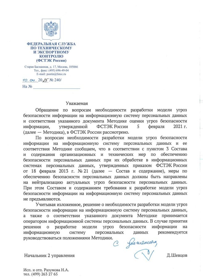 Ответ, полученный от ФСТЭК в этом году, говорит нам, что: