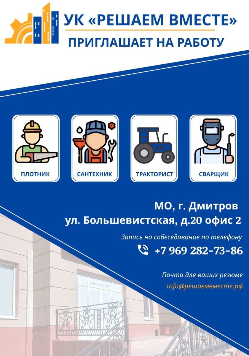 Внимание! Внимание! Управляющая компания ищет сотрудников на следующие вакансии: ➡️ПЛОТНИК ➡️САНТЕХНИК ➡️ТРАКТОРИСТ ➡️СВАРЩИК Если Вы подумывали о смене работы, и хотите работать рядом с домом в стабильной компании, то наши вакансии для Вас! Со своей стороны гарантируем оформление по ТК РФ, достойный уровень заработной платы, рабочую одежду и весь инструмент. От Вас ждем ответственного подхода к работе, чистоту рабочего места, пунктуальность и стрессоустойчивость. Все вопросы обсуждаем на собеседовании🤝 Звоните и приходите в наш дружный коллектив👫 Update: пока вы думали, мы уже взяли на работу сантехника🫡 С уважением, управляющая компания "Решаем вместе" 📱 Мы в МАХ 📱 Мы в Vk 💌 Написать нам