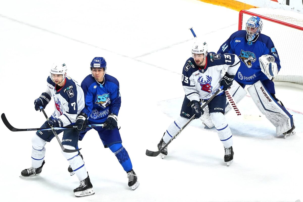 На фото: Егор Соколов (№ 13) и Максим Летунов (№ 7) в матче против «Барыса» составили первую тройку вместе с Егором Виноградовым.