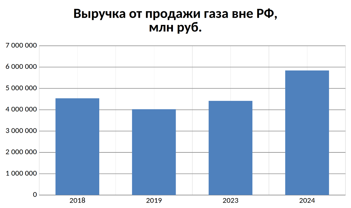 Текущий нарратив таков, что продаём меньше объёмов газа, и по дешёвым ценам! При этом непонятно откуда берутся данные утверждения и чем оперируются! В таблице представлена выручка от продажи газа Газпромом зарубежным потребителям, без учёта ретроактивной корректировки цены на газ. Простым языком по той цене или ориентировочной цене, которая действовала на момент поставки Взят именно период до СВО и настоящее время! По отчётности самой компании! 2020-2023 гг не очень презентабельны, так как объёмы поставок, от всех случившихся форс-мажоров (в том числе ценовых), удалось выровнять к 2023-2024 гг. Данные цифры приводятся для того, чтобы показать, что было «ДО»! При этом «конструктивные» критики не отвечают на вопрос, каким тогда образом выручка компании увеличилась на 66% с 6 трлн руб. до 10 трлн руб. А если обратиться к вышеобозначенному графику, то каким образом мы приблизились к показателя 2019 года после СВО, где газа мы продавали очень много в Европу, если мы сейчас газа продаём мало