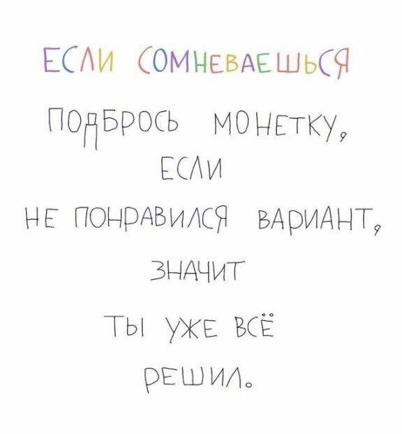 Когда сомнения гложет: как простое действие может помочь определиться Ну, люблю я простые практики 😅 Итак, если вы столкнулись с выбором 🤔 и не можете определиться, подбросьте монетку! 🪙 Если результат подброска монеты вам не нравится, это может стать сигналом для вас. Вы почувствуете внутри себя, что вам на самом деле важно другое решение, и в этом случае ваше решение уже будет принято — вы выбрали то, что вам действительно нравится. Пусть в вашей жизни все складывается легко и в удовольствии, с любовью Алена Дяжурова💖💖💖