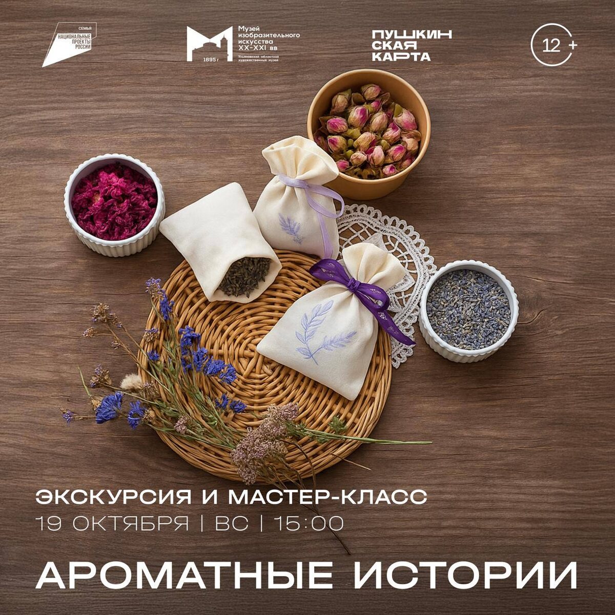 Экскурсия и мастер-класс «Ароматные истории» 🗓️ 19 октября, 15:00 📍Музей изобразительного искусства XX-XXI вв. Мы посмотрим на пейзажи Константина Финогенова, Александра Герасимова, Георгия Нисского, Сергея Герасимова, Николая Крымова, Станислава Жуковского, Юлиана Клевера, Константина Коровина, Натальи Гончаровой и других великих художников XX века и будем искать в них оттенки, чувства и… запахи. После экскурсии вас ждет мастер-класс «Ароматные истории», на котором вы научитесь создавать флористические саше. Саше – это тканевый мешочек с сыпучим душистым наполнителем для придания приятного аромата одежде или помещению. Билеты 🎟️ #19октября25@culturnik