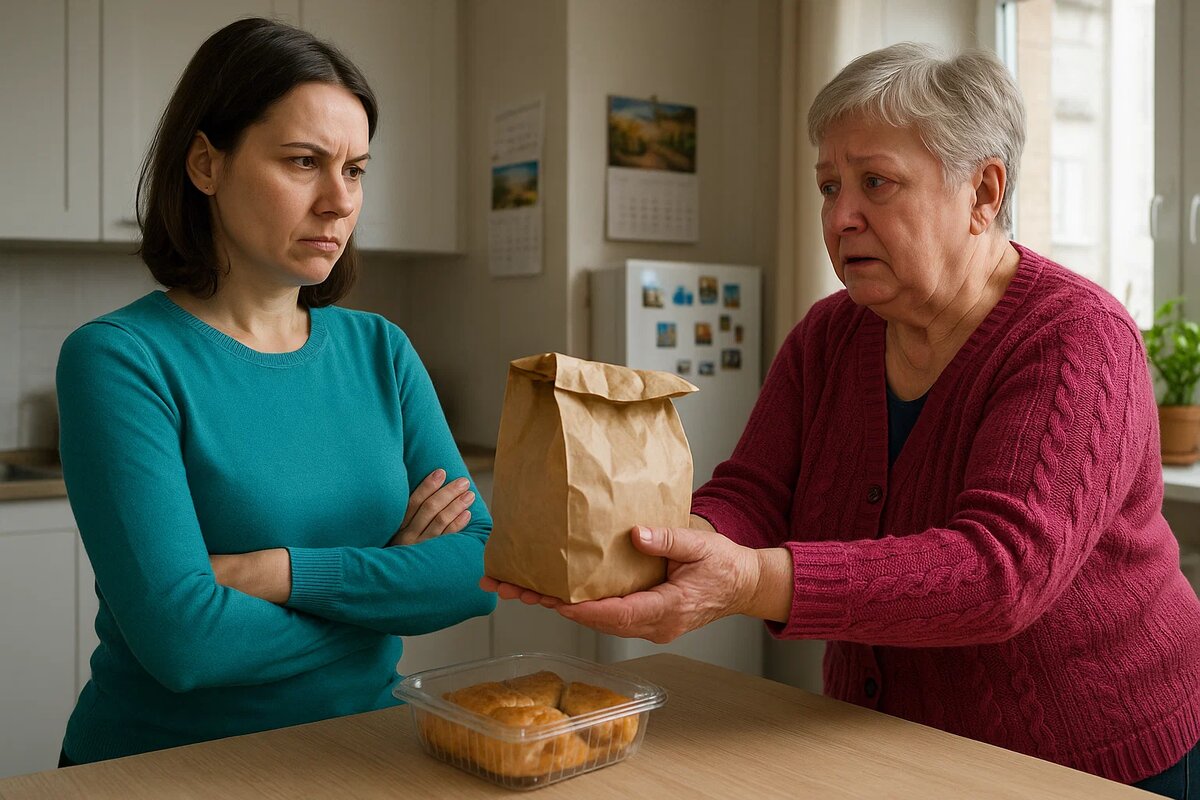 Вера открыла — на пороге стояла мать. С пакетом в руках, помятым. Лицо усталое, глаза красные.