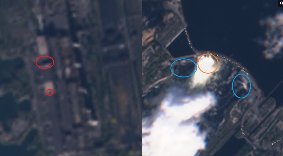 Пролетел спутник, что видно: 1) Добротворская и Бурштынская ТЭС в работе; 2) Прилёты в Криворожскую ТЭС (снимок слева), один серьёзный пролом (похоже рухнул пролёт крыши) и одно пробитие. Не работает. 3) На ДнепроГЭСе (снимок справа), похоже, имеются рабочие агрегаты - виден проход воды через машзалы (голубое). Рыжее - то ли облако удачно приклеилось, то ли сброс воды (скорее первое). 4) Приднепровская ТЭС - не понятно.