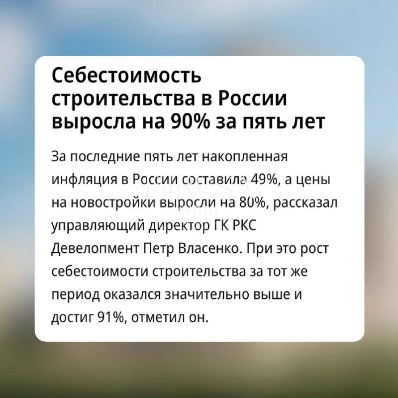 90% — именно на столько выросла себестоимость строительства за последние 5 лет Для сравнения: → Цены на новостройки — +80% → Инфляция — всего +49% Цифры говорят сами за себя. А те, кто ждут «идеального момента», уже несколько лет ждут впустую. В Москве сейчас себестоимость квадрата — 158,3 тыс₽. В январе было 145,7 тыс₽ — рост на 8,2% всего за восемь месяцев. И это при том, что дорожает буквально всё: материалы, рабочая сила, логистика. А значит, нынешние скидки и спецусловия — это не «маркетинг», а последний шанс войти в проект по старой экономике. _______ 🔥 Запишитесь на бесплатную консультацию — разберём ваш бюджет и подберём проект, где цена всё ещё на вашей стороне.