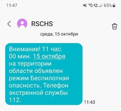 Жители Челябинской области получили SMS о возможной атаке БПЛА, передает корреспондент Агентства новостей «Доступ». «Внимание! С 11:00 15 октября на территории области объявлен режим "Беспилотная опасность". Телефон экстренной службы 112», – говорится в коротком сообщении. В региональном Главке МЧС и пресс-службе регионального правительства пока не готовы комментировать рассылку. Добавим, что сегодня и на территории Свердловской области действует предупреждение о беспилотной опасности. «Возможны временные ограничения на работу мобильного интернета. Специальные службы отслеживают оперативную обстановку», – говорится в сообщении властей соседнего региона.