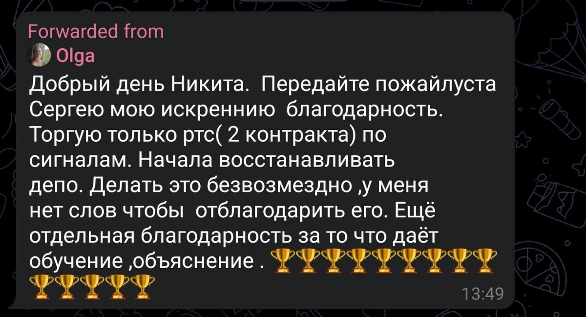 📩 Комментарий от читательницы Пришёл отзыв через моего помощника. Признаться, читать такие вещи приятно — не потому что хвалят, а потому что видно: человек не просто читает, а понимает, о чём речь. 🙏 Ольга, благодарю за внимание и за то, что разбираетесь в логике системы. Но подчеркну — смысл не в том, чтобы просто торговать по сигналам. Главная цель — научиться видеть рынок самому, без посредников и чужих мнений. У меня есть готовые стратегии, и они работают, принося на дистанции статистическое преимущество. Но я не сторонник механической торговли. Стратегии — это инструмент для того, чтобы на пустом графике появились точки принятия решения. А принимать решение должен ваш опыт, исходя из общей картины. К тому и нужно стремиться прийти. Всем хороших торгов! ⚡📊