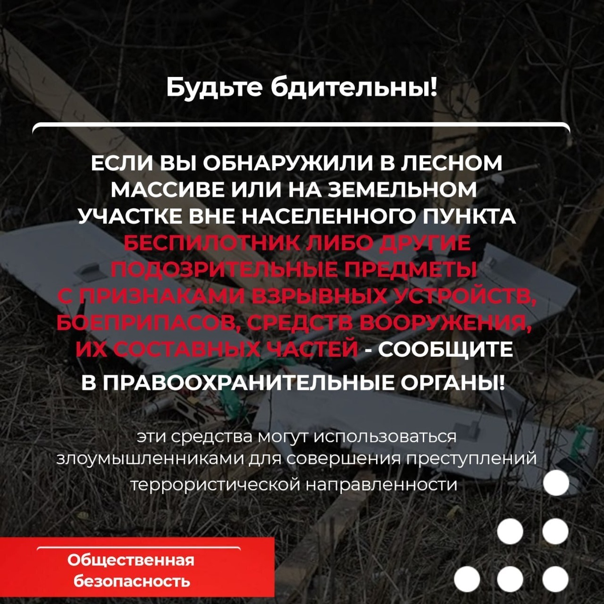 ❗Внимание! Находка в лесу или за городом? Не трогайте! Правоохранительные органы настоятельно просят: если вы обнаружили в лесу или где-либо за городом беспилотник, его части или любой предмет, похожий на взрывное устройство, боеприпас или оружие, немедленно сообщите об этом в дежурную часть! Категорически запрещено трогать, вскрывать или перемещать такие находки. Также опасно использовать рядом с ними мобильные телефоны и другие средства связи. Подробности – в карточках. #УрицкийРайон #АдминистрацияУрицкогорайонаОрловскойобласти