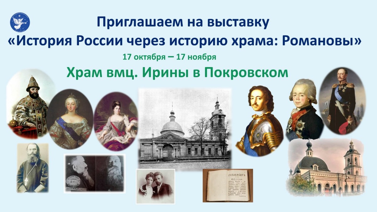 Приглашаем посетить уникальную выставку «История России через историю храма: Романовы» ✅ Дата открытия: 17 октября в 19 часов ✅ Место проведения: храм великомученицы Ирины в Покровском по адресу: Москва, улица Фридриха Энгельса, дом 38. Проезд: метро Бауманская ✅ Время работы: ежедневно 9:00 - 20:00 ✅ Вход бесплатный Храм, в котором будет проводиться выставка, освящен в честь Ирины — дочери Михаила Федоровича, родоначальника династии Романовых. Ирининский храм был выстроен в Покровском, потому что именно здесь родилась царевна Ирина. Во время подготовки выставки были собраны интересные факты, архивные фотографии, сохранившиеся планы и карты села Рубцово (Покровского), рисунки и фотографии храма Ирины и других храмов в Покровском. Вы узнаете новые факты о связи событий царской России с целой династией царей, которые сменяли друг друга на престоле в течение 300 лет. Увидите, отображенное в фотографиях и документах величие и могущество Российской империи. ✅ Организаторы выставки -