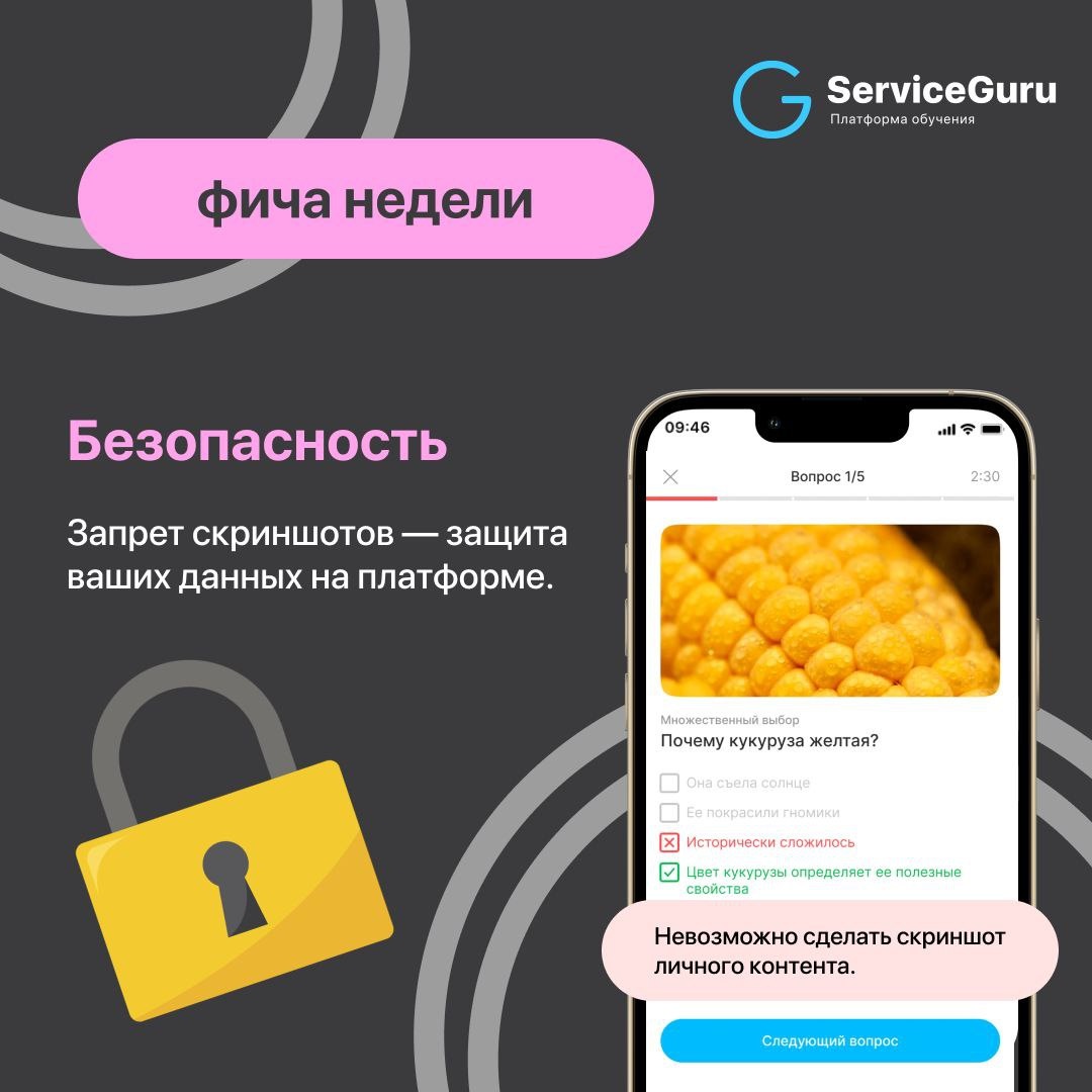 Фича недели: Безопасность 🛡 Запрет скриншотов — защита ваших данных на платформе! ✅ Надежная защита ваших учебных материалов ✅ Повышение релевантности ответов во время тестов и аттестаций: нельзя сделать скриншот теста и поделиться с коллегами ✅ Уведомление о запрете скриншотов для сотрудников ServiceGuru позволяет хранить всю важную информацию в одном месте и не беспокоиться о том, что она попадет не в те руки! 💬 Получить бесплатный демо-доступ к платформе #фича_недели