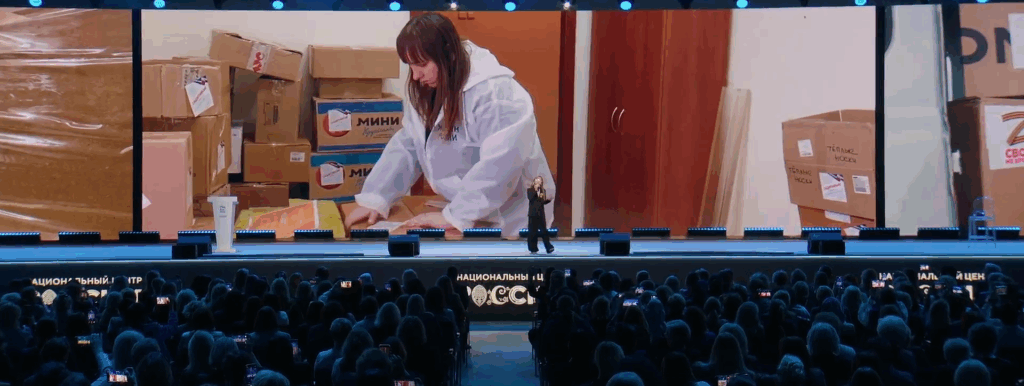 Во время исполнения на экранах показали видеоряд с кадрами сбора гуманитарной помощи для военных и личными моментами из жизни семьи — в том числе встречи девочки с отцом.