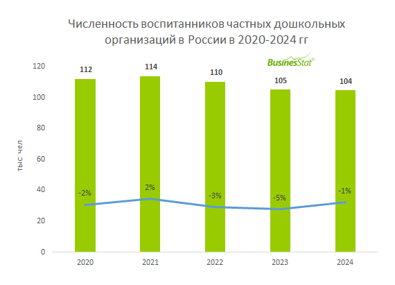 По данным "Анализа рынка дошкольного образования в России", подготовленного BusinesStat в 2025 г, за 2020-2024 гг в стране количество воспитанников коммерческих детских садов уменьшилось на 7%: со 112 до 104 тыс чел. Причинами спада послужили сокращение численности детей дошкольного возраста и увеличение доступности мест в муниципальных дошкольных учреждениях. Потенциальные потребители услуг частных детских садов смогли получить места в детских садах госсектора. При этом спад коммерческого сектора рынка дошкольного образования в России сдерживается за счет господдержки. В рамках нацпроекта «Малое и среднее предпринимательство» руководители частных детских садов получали бюджетные средства для покрытия затрат на образовательную деятельность. В 2024 г ряду регионов выделялись субсидии на создание дополнительных мест для детей в возрасте от 1,5 до 3 лет в частных детских садах. Кроме того, положительное влияние на коммерческий сектор оказало снятие излишних административных и финансовых б