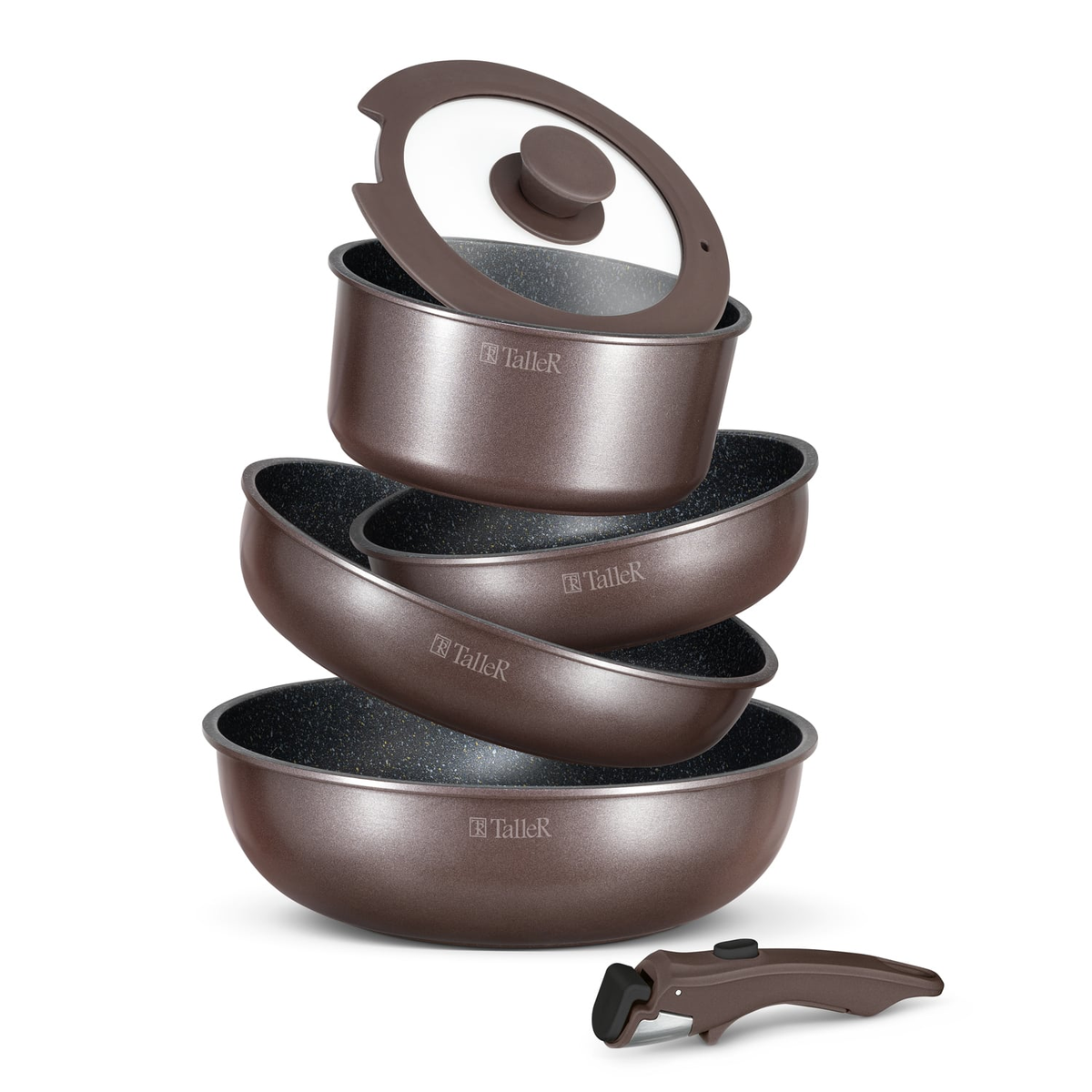 🔸Состав набора: -сковорода 20 х 5,5 см -сковорода 24 х 6 см -сковорода глубокая 26 х 8 см -ковш 2 л -крышка 18 см -универсальная съемная ручка 🔸Набор выполнен из литого алюминия с двухслойным антипригарным покрытием. 🔸Компактное хранение. Благодаря съемной ручке посуда занимает минимум места, экономя пространство на кухне. 🔸Долговечное антипригарное покрытие. Двухслойное покрытие посуды защищает от пригорания, легко моется и долго служит. 🔸Эргономичная ручка выдерживает вес сковород с продуктами и легко фиксируется, делая процесс приготовления и сервировки максимально комфортным. 🔸Идеальное распределение тепла. 🔸Дно с индукционным диском обеспечивает идеальное распределение тепла и устойчиво к деформации. Толщина дна 3,5 мм. Стиль и долговечность. Прочный корпус из литого алюминия гарантирует долгий срок службы и стильный внешний вид. 🔸Благодаря съемной ручке посуда подходит как для использования на плите, так и для запекания в духовке без ручки. _______________________________