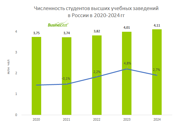 В 2024 г численность студентов высших учебных заведений в России выросла на 3% до 4,11 млн чел.