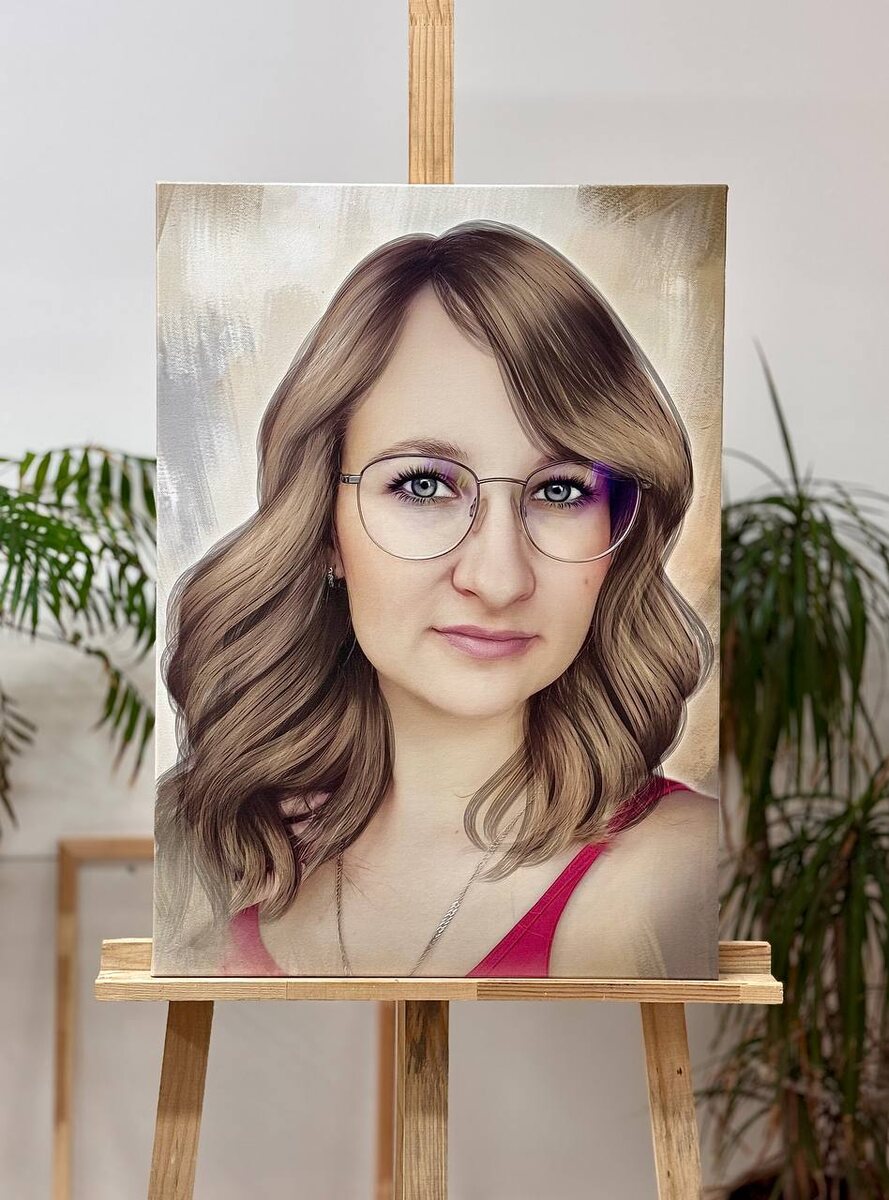 ✨ Портрет, в котором видно душу Этот холст — не просто увеличенная фотография. Здесь каждая деталь — от блеска в глазах за очками до мягкой фактуры волос — прорисована вручную художником, чтобы сохранить ваш образ живым и естественным. 🖌 Что мы делаем по-настоящему: — Ручная цифровая прорисовка — художник прорабатывает мимику, блики в очках, текстуру кожи и волос, чтобы портрет был реалистичным, но при этом художественным; — Премиум-материалы — натуральный хлопковый холст, стойкие пигментные чернила и аккуратная натяжка на деревянный подрамник; — Эскиз для согласования — прежде чем печатать, вы утвердите вариант и при необходимости попросите правки; — Аккуратная упаковка и готовый к развешиванию результат. 🎁 Идеален как подарок себе, маме, подруге или коллеге — портрет смотрится дорого и трогательно одновременно. 💡 Интересный факт: правильно подобранный портретный фон и свет делают выражение лица более «читаемым» — даже небольшая правка света в глазах меняет восприятие образа.
