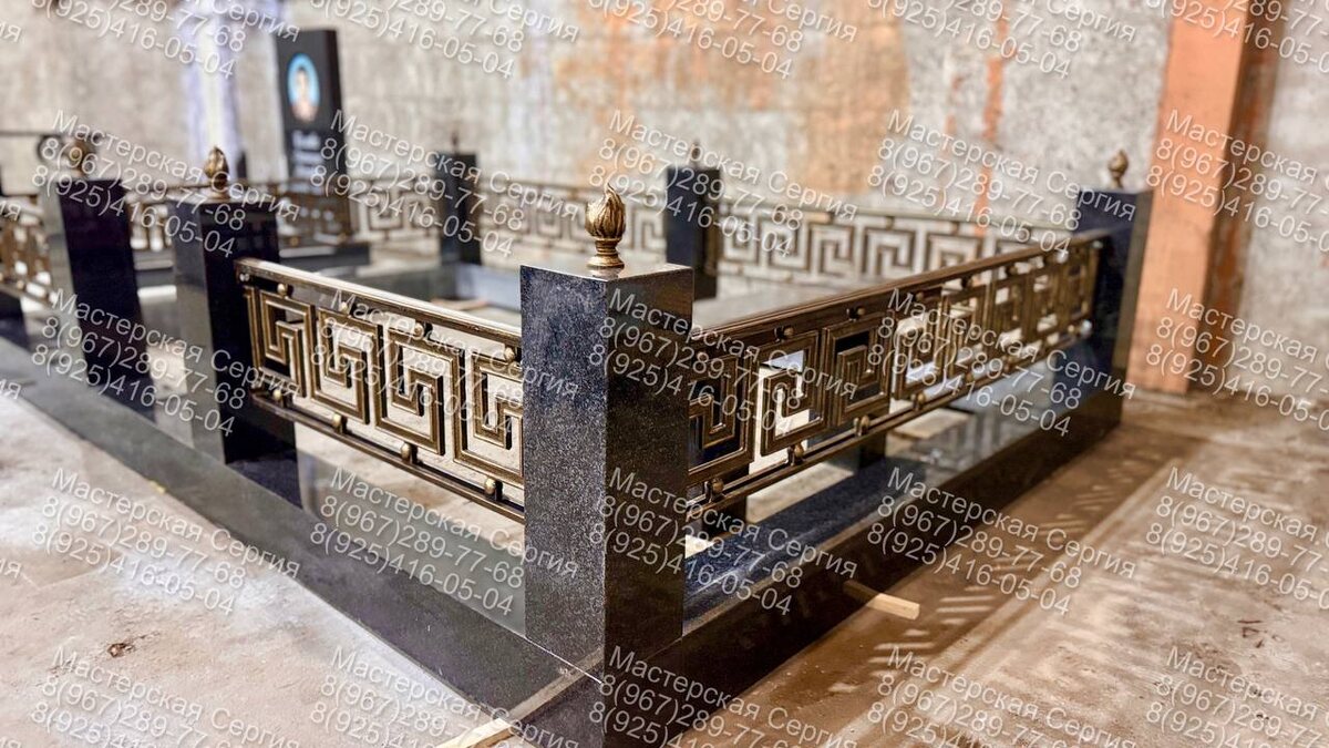 — Художественное литьё — секции ограды с выразительным рисунком, гармонично соединяющимся с чёрным гранитом.